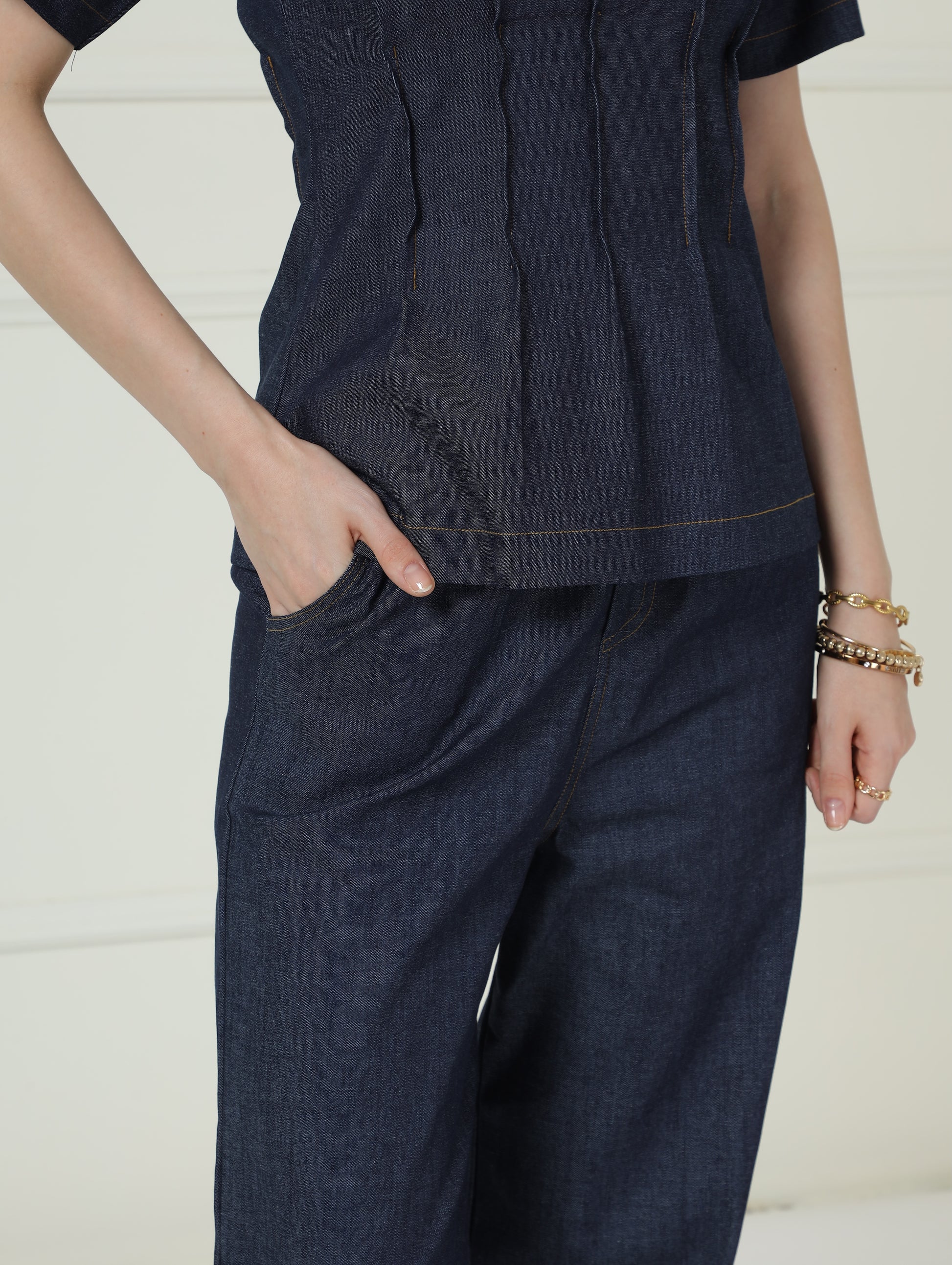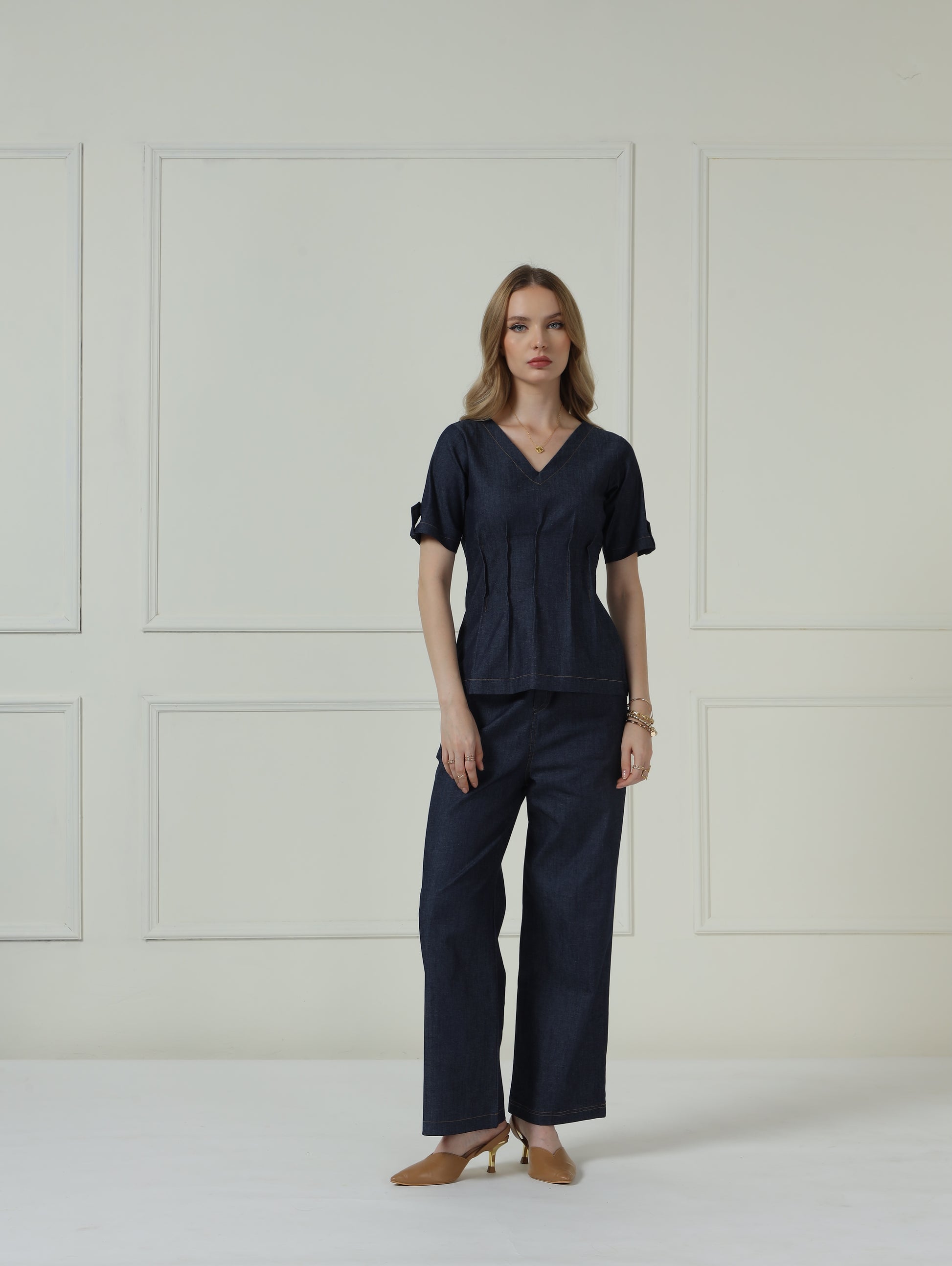 Classy stretchable denim draped top with pants.